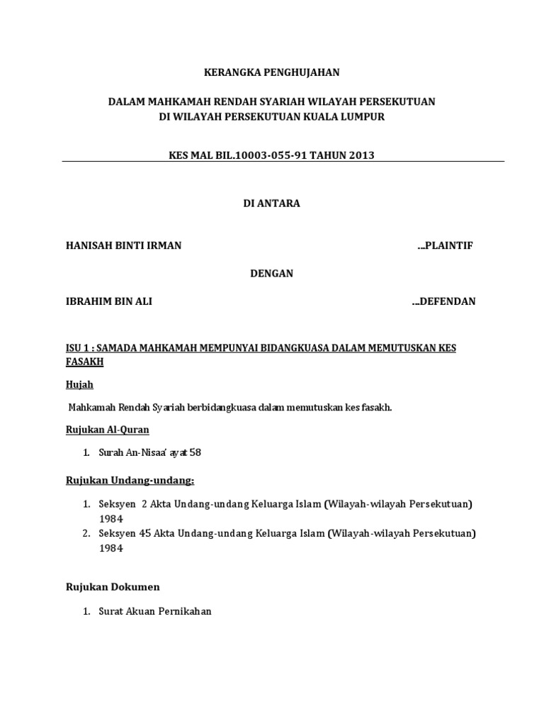 Kerangka Penghujahan Plaintif Kes Fasakh