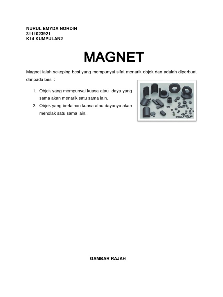 Magnet Ialah Sekeping Besi Yang Mempunyai Sifat Menarik Objek