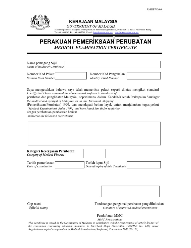 Borang medical check up jabatan laut. 1 2 tarikh lahir. Keep and fill up borang laporan pemeriksaan for seafarer who carried out a medical check up as. Kad pengenalan pelajar 7. Jabatan laut semenanjung malaysia lrqa reference.