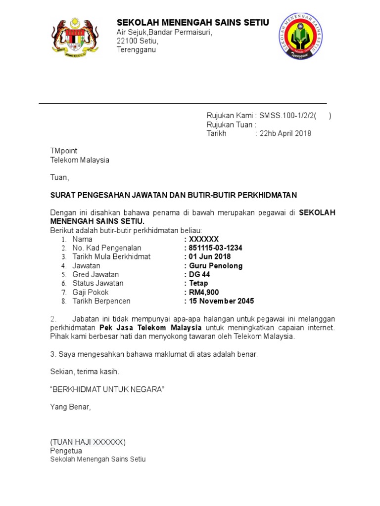 Contoh Surat Pengesahan Jawatan