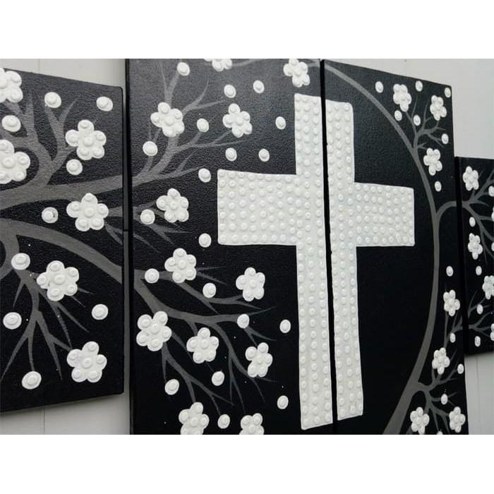 Lukisan Salib Minimalis Bunga Sakura Hitam Putih Dot Aborigin